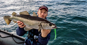 Nous abordons la zone difficilement car il y a un beau clapot formé par le vent contre le courant. Une fois bien en place, nous dérivons tout de même à 4/5 km/h, il est difficile d'atteindre le fond avec nos leurres... Nous cherchons des têtes de roche car bien souvent , lorsqu'il y a beaucoup de "jus", les lieus s'abritent derrière. Nous avons de nombreuses attaques mais il n'y a pas moyen de ferrer un poisson; soit ce sont des juvéniles, soit ce sont des poissons très méfiants... Camille ouvre enfin le bal avec un lieu portion, puis c'est à mon tour. Ils ne dépassent pas le kilo, c'est pour cela que nous n'arrivons pas à les piquer facilement avec nos "bouchées" de 22 cm...
