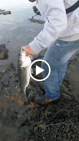 Je reprends ma canne et recommence à lancer sur ma gauche. Près d'un gros paquet de goémon, j'ai une grosse aspiration sur mon Asturie!!! Je ferre, c'est pendu! Le problème c'est que ma ligne s'est emmêlée dans les algues... Je lève la canne le plus haut possible en espérant que la tresse sortira toute seule de cet obstacle. Après quelques longues minutes, la ligne se dégage ! Les choses sérieuses commencent... Jusqu'ici on avait pas pu évaluer la taille du poisson, il a l'air joli, même très joli! Ce bar à encore de l'énergie à revendre, il tente à plusieurs reprises de se caler derrière des rochers couverts de moules tranchantes. Il finit par s'épuiser et je le dépose calmement sur le bord. Nous faisons rapidement quelques photos et le remettons vite à l'eau.
